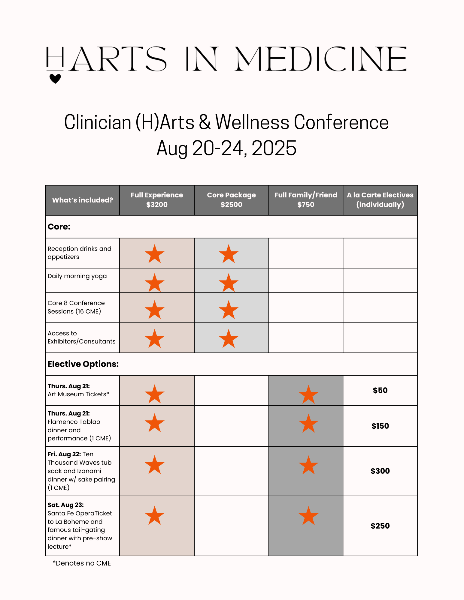 (H)Arts in Medicine reserves the right to cancel the conference for any reason, without cause. If we need to cancel the conference for any reason, we will refund our participants in full, minus the processing fees required by our sales platform.